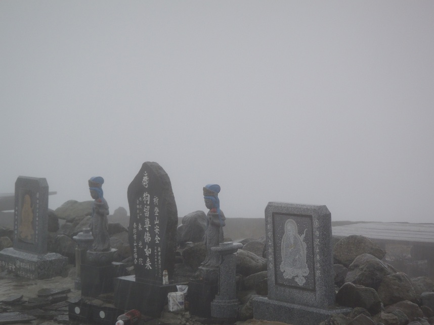 階段をひたすら上り、木道が敷いてあるところまでくると雨脚が強まり、ガスがたちこめた。