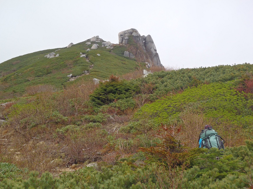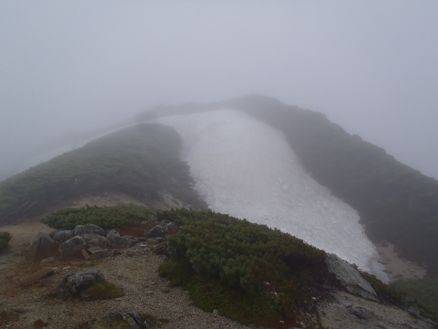 2日目、3時半に起床。外の様子を伺うと風が強く、ガスが濃く、湿気も酷かった。この時は昨日の判断を少し後悔した。itさんと朝食を摂りつつ相談し、状況が悪化するようだったら来た道を引き返すか、檜尾岳まで行って降りることにしようということになった。その後4時半に外の状況を確認すると、ガスはあるが明るくなり、視界はあるので先へ進むことにした。
