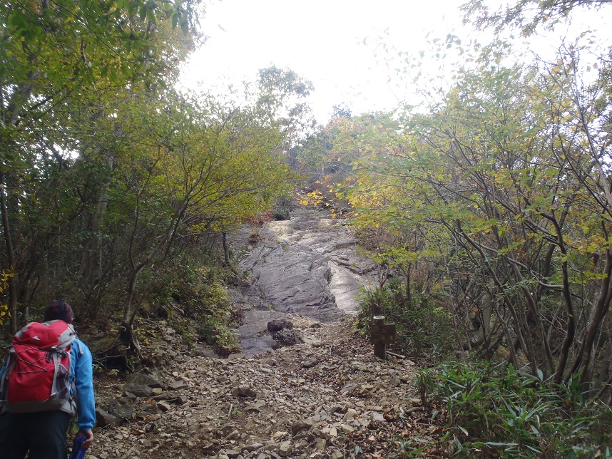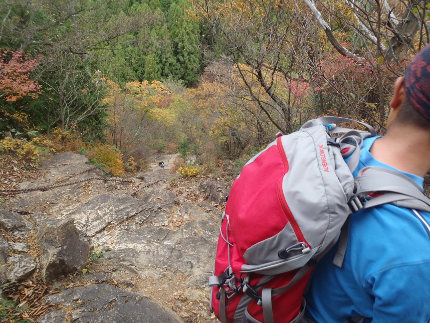 木の実が多く落ちた山道を1時間程登って、本日のメインの男坂に到着した。ロープが張られ、落石注意・自己責任との看板があった。しかし取り付いてみると意外に傾斜はあり、鎖を使わずとも足をかけられる場所が多く、慎重に行くと初心者の自分で緊張することはなかった。