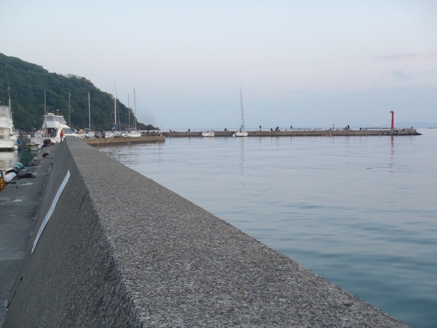 移動先は勝山港南側赤灯堤防。ここも釣り客が多く、先端付近は満員だった。