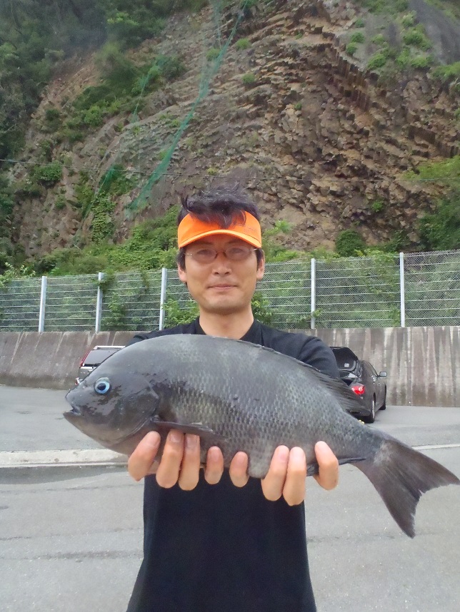 5:00~14:00 szさん、ngとの妻良沖磯釣行。 湾外はうねりが大きなために、湾内の磯の京の字に渡った。 京の字の近くの根を乗越えた波が表面を滑る流れになって先端沖向きは釣りにならず。 3人ともに妻良港向きに釣座を構えた。 撒き餌を使うと前回同様に小サバが群れてきてしまい、先行きの不安なスタート。 仕掛けを重くしてなんとか小サバをかわそうとしたが、8割は仕掛けが着水して間もなく小サバに食われる状況だった。 サバが去るまで諦めて一眠りするかとしていたところ、szさんが35cmのメジナを釣り上げ、遠投で深いタナに仕掛けを運べればメジナが待っていると教えてくれた。 szさんと同じように遠投し、仕掛けを沈めながら手前にゆっくりと引いていくと小サバではないあたりがあり、合わせたがすぐに仕掛けが高切れしてしまった。 沈む00号の浮と水中浮は回収できず、10分ほど落胆し、朝食を食べて釣りを再開した。 何投かした後に重いあたりがあり、合わせて糸を巻くと足元で強烈な潜り込みをくらい、慌てて糸を出した。 何度か潜り込みをいなした後にやっと浮いてきたのは40cm超の大きなメジナ。 最後まで振り回されたが、szさんにタモ入れをしてもらってなんとか釣り上げることができた。 サイズは後のお楽しみとバッカンに魚を入れて2匹目を狙うが、小サバがさらに増えて釣りにならず。 そんな中でもszさんはイサキ、メジナ、アイゴと釣上げていたので、釣りの調子の上手さがあるのかなと思った。 ngは磯の先端でウツボを釣上げたりしていたが、上滑りの潮と小サバに難渋し、根掛かり後に竿の先端を折ってしまって投了モード。 こちらも小サバに辟易し、休んでは仕掛けを換えを繰り返し、普段ではやらないアンバランスな仕掛けも試してみたが、たまに釣れるメジナは小さなものだった。 12時を回って、よく引く魚を掛けて期待したが大きなサンノジだった。 最後にngの大量に余った撒き餌をドカ撒きしたが、海面が波立つほどのサバの群れ。 サバの活性がますます上がってしまい、どこに何をしようが仕掛けが沈まなくなってしまったので、少し早めに納竿して迎えの船を待った。 港に戻り、釣れたメジナのサイズを測ってみると45cm。 ngが尾っぽをぴんと伸ばしてくれて46cmということになった。 自己記録更新で気分も良く、潮の飛沫でベトベトになった体を伊豆高原の湯で洗い流し、さっぱりして帰路へ。 |