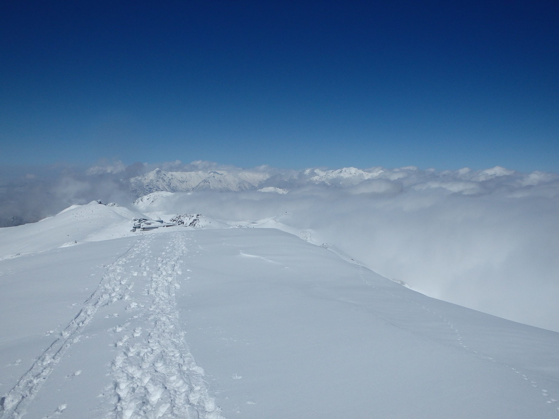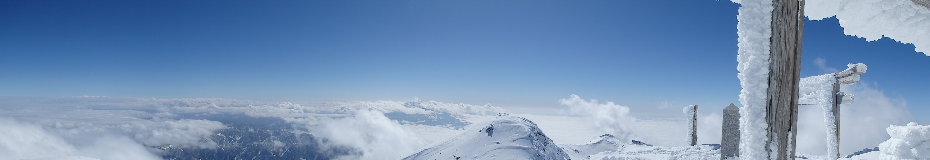 Mt.乗鞍スノーリゾート駐車場(8:30)→カモシカリフト終点(9:30)→肩の小屋口付近(12:30)→朝日岳(13:10)→剣が峰(13:30)→駐車場(15:40)