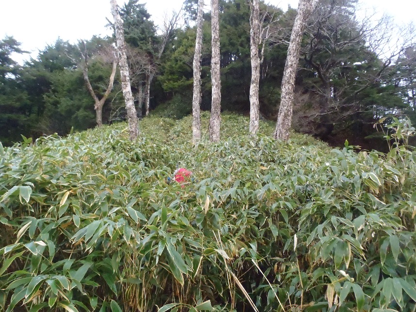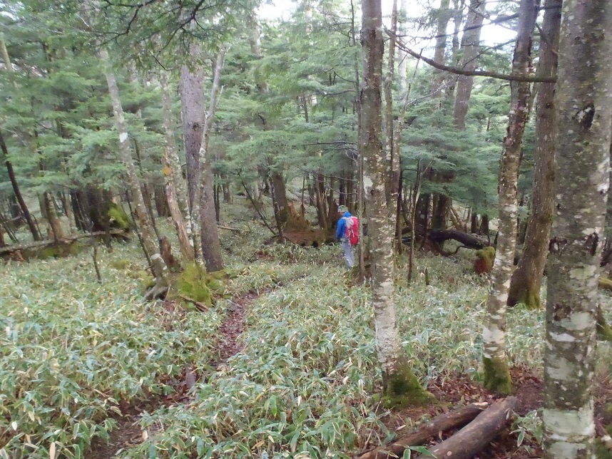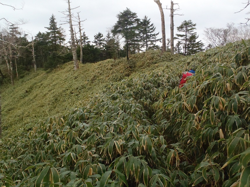笹の背が顔近くまで伸びた状態が続いており、ルートを見失っては目印のリボンや標識を探し、笹で見えない木の根を踏んでは滑り、倒木にすねをしこたまぶつけては顔をゆがめた。