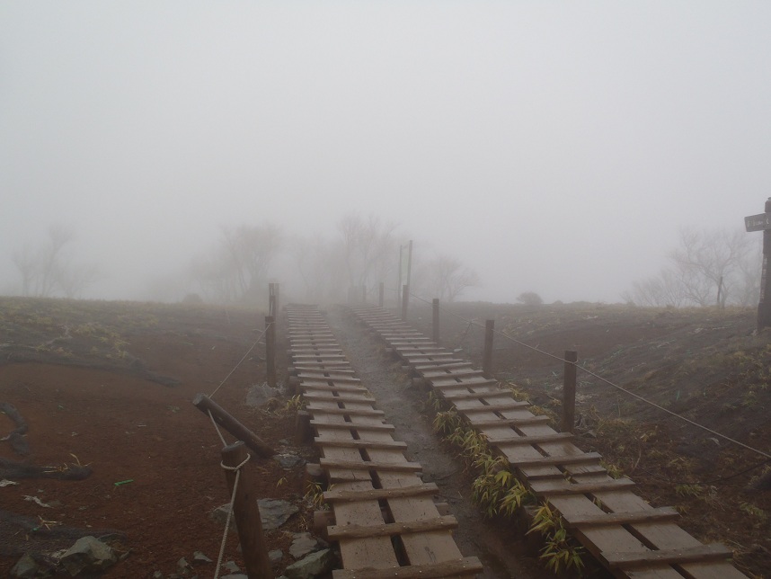 階段をひたすら上り、木道が敷いてあるところまでくると雨脚が強まり、ガスがたちこめた。