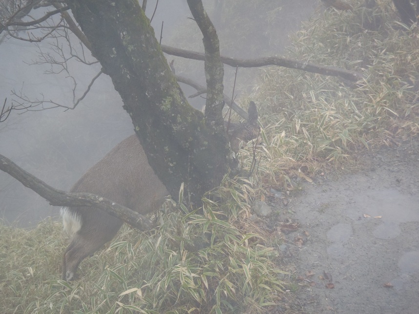 山道沿いで笹を食む鹿。
