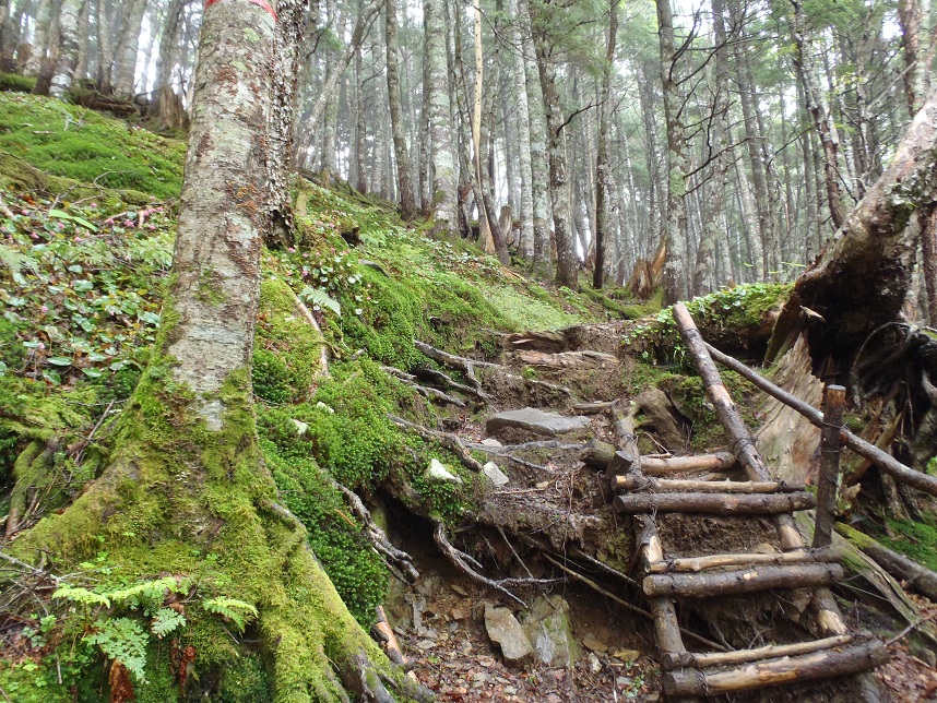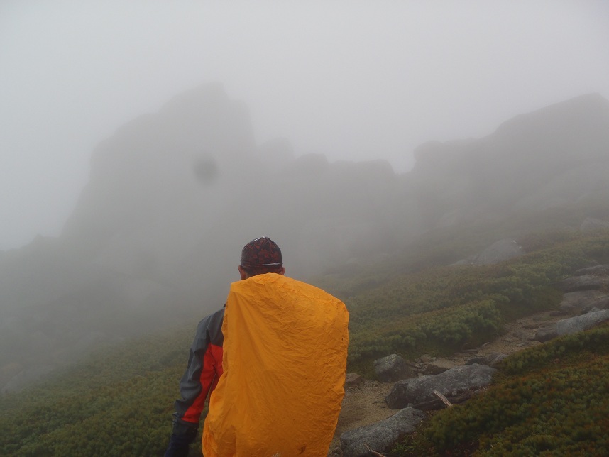 1日目駒ヶ根高原の菅ノ台バスセンター付近の駐車場に4時ごろに到着。しばらく仮眠をとった後、明るくなった5時に出発した。この日は曇りで心配していた雨は降らなかった。池山小屋までは登山道ではなく、遊歩道を優先して通り、体力を温存した。梯子や橋のかかる大地獄、小地獄を超えて、池山尾根でいくつかのこぶを越えた後に空木岳頂上へ到着。ガスが濃く、またもや見晴らしは無し。すれ違った登山客は4グループだった。檜尾岳までは体力が持たないと判断して、この日は木曽殿越の木曽殿山荘の倉庫に宿泊。その後風が出始め、ガスがさらに濃くなり、気温も下がったために、判断は正解だったと思った。