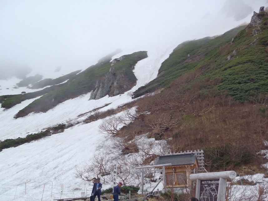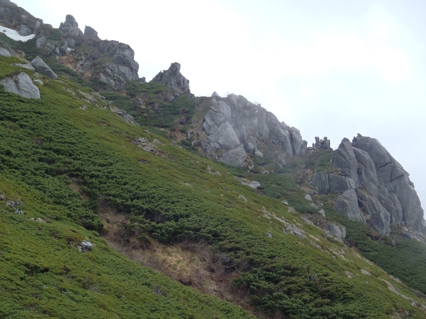 東川岳、足場の悪い熊沢五峰、熊沢岳を超えて檜尾岳へ。ここで元々の計画である千畳敷まで行くことにしたが、ここまでのペースが速かったせいかしばらくするとルートの高低差でばててしまった。itさんに登りでは休まずに行くべしと叱られながら、とぼとぼと足を進めて島田娘へ。ルート上に残雪が混じることが2、3度あり、雪の上によじ登るのに苦労した。高低差の無い極楽平までくると少し心身が回復し、最後に軽アイゼンを付けて千畳敷の雪を蹴り分けながらロープウエイの駅に到着。この日にすれ違った登山客はいなかった。