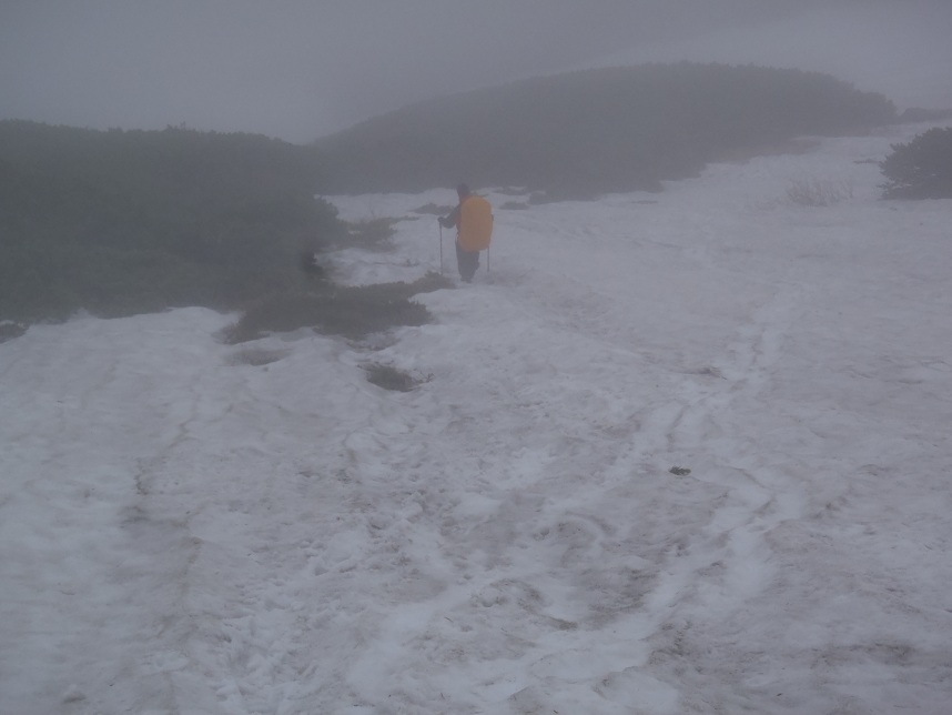 2日目、3時半に起床。外の様子を伺うと風が強く、ガスが濃く、湿気も酷かった。この時は昨日の判断を少し後悔した。itさんと朝食を摂りつつ相談し、状況が悪化するようだったら来た道を引き返すか、檜尾岳まで行って降りることにしようということになった。その後4時半に外の状況を確認すると、ガスはあるが明るくなり、視界はあるので先へ進むことにした。
