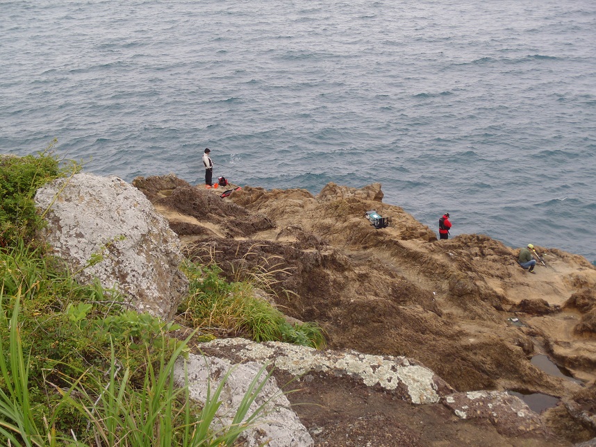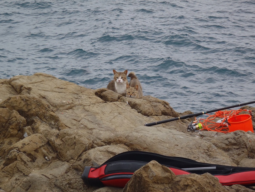 灯台島の釣り場。猫様のためにがんばる二人。