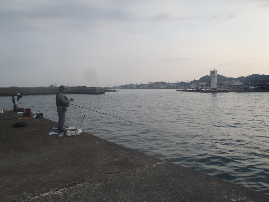 夕暮れの千倉港。赤灯ではクロダイ釣、中央では家族連れのサビキ。たまに子供の歓声が上がっていた。