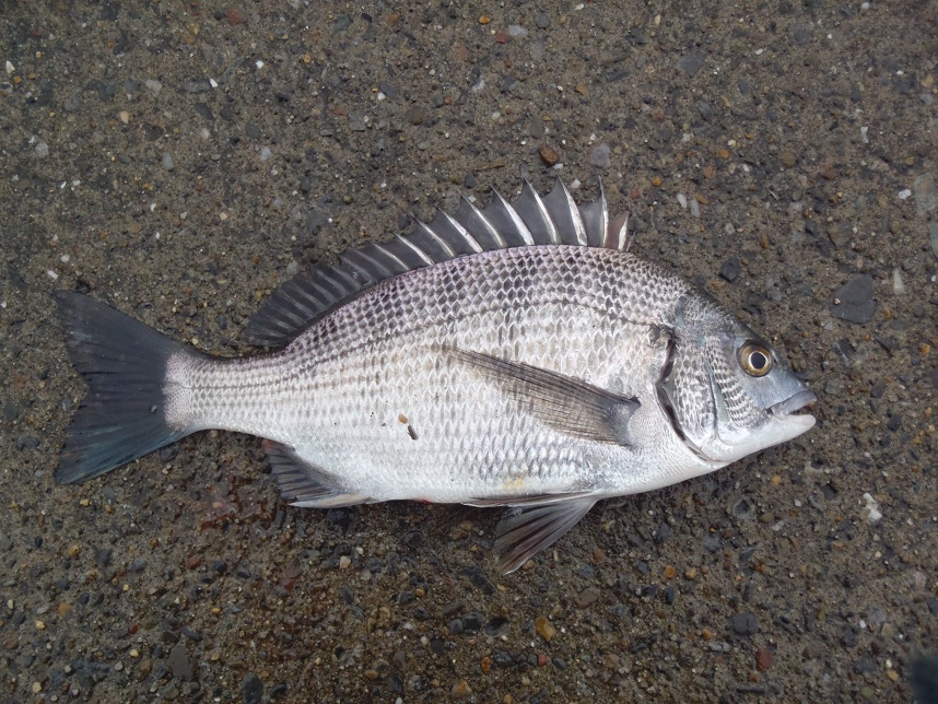 風が幾分収まって釣りを再開した直後、仕掛けを巻き取る前に聞き合わせをすると重みがあり、クロダイがかかった。今回も手のひらサイズ。