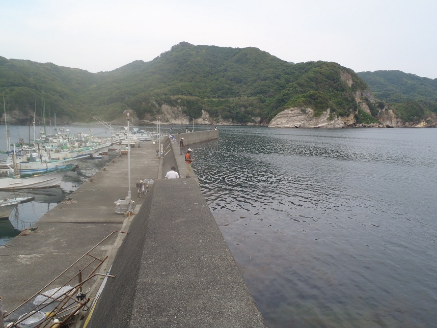 子浦港の堤防。足元には海藻が茂り、イカ狙いの人が多かった。アジやカマスもでていると話を聞いた。