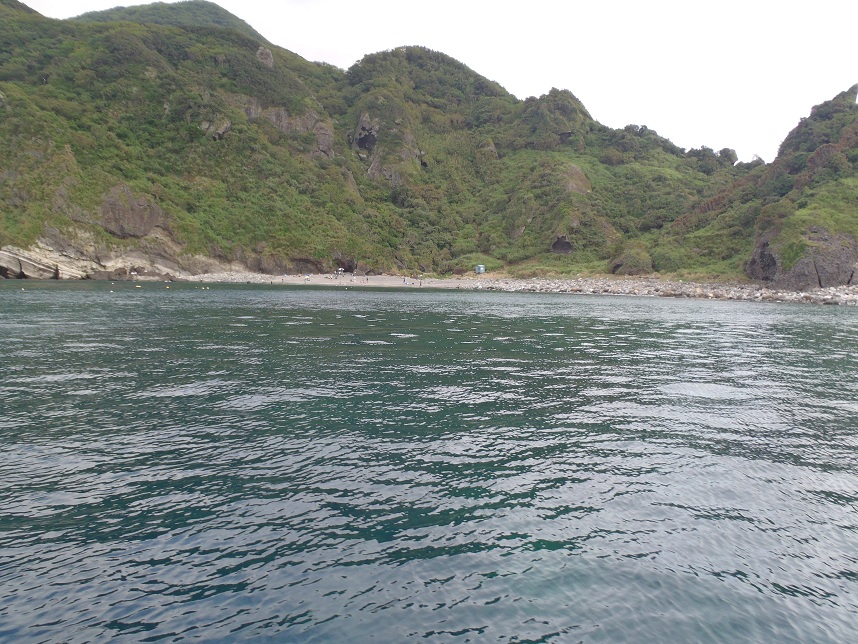 船で渡る谷川海水浴場。サザエ拾いができる。