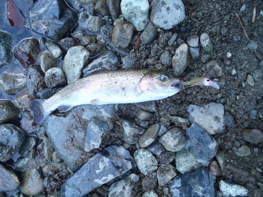 日没が近づくと前回と同様に魚の活性が高まり、ゆっくり巻くだけでマスが釣れるようになった。