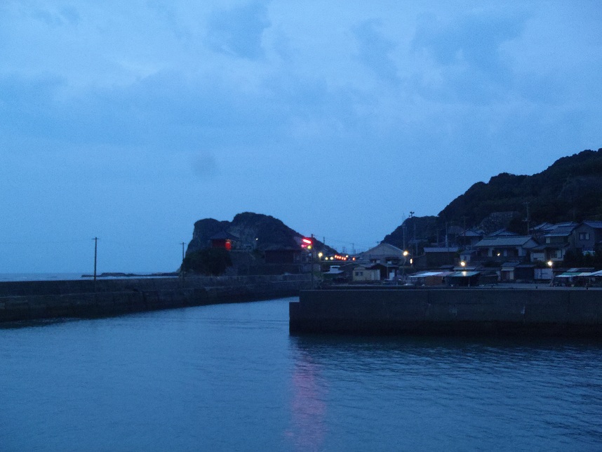夜中の1時頃に岩船港に到着。付近の天王神社や岩船地蔵尊が祭りの提灯で明明と飾られていた。