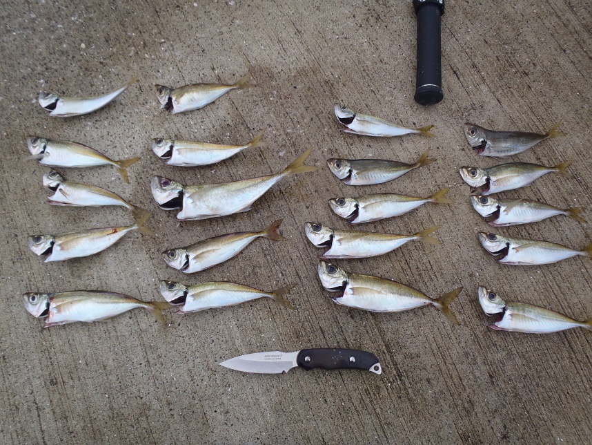 再度雨で一時撤退をしたが、5時半から7時くらいまでアジが釣れ続け、3人合わせて21匹のアジを釣り上げられた。