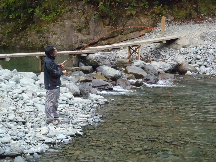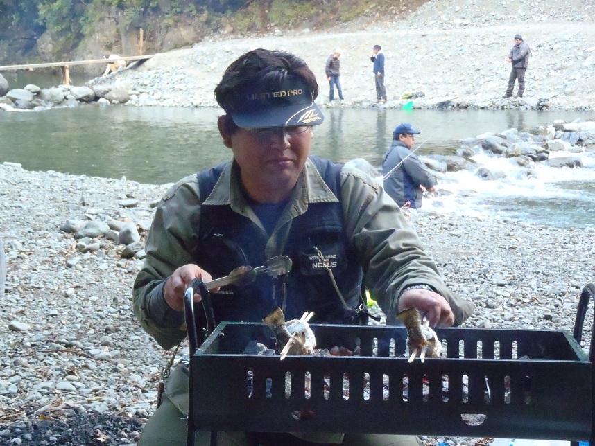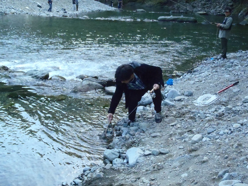 8人が釣りをしてボウズが2人。釣果はマスが15匹程でイワナは当日放流されていたが残念ながら0匹。