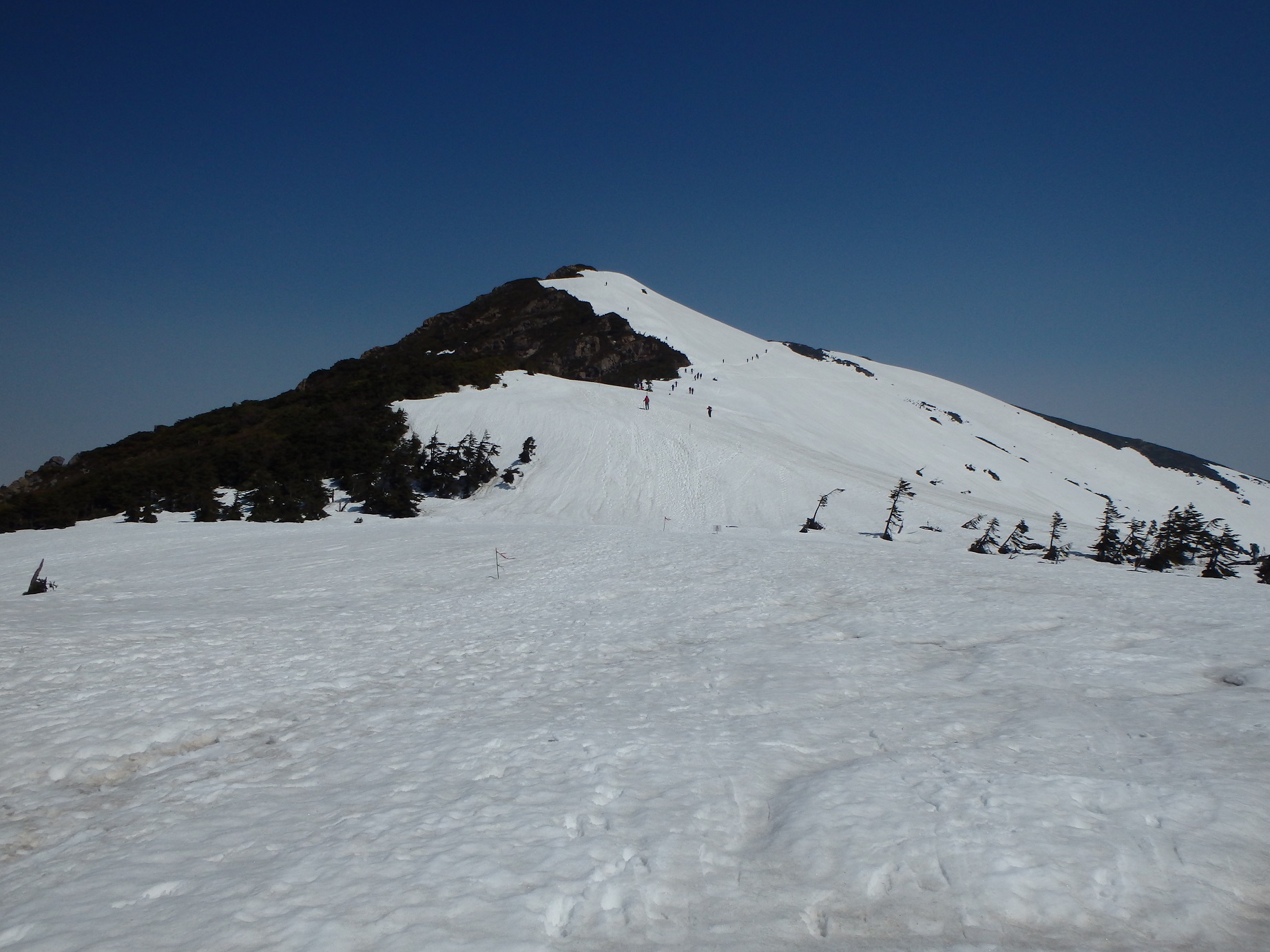 群馬県至仏山 ・ルート 戸倉→鳩待峠(8:00)→小至仏山(9:40)→至仏山山頂(10:10)→山の鼻(11:20)→鳩待峠(12:40) itさんとの群馬尾瀬の至仏山登山。 鳩待峠まで車で行く予定だったが、戸倉で鳩待満車の看板。 戸倉からバスで鳩待峠に向かった。 鳩待峠の駐車場から登山開始。雪はシャーベット状になっていたが硬く凍っている場所は無く、結局アイゼンは使わなかった。 天気予報に反してよく晴れて暑く、ばててしまった乗鞍の反省から、尾根に上がるまでは薄着にして、汗をかいて体力を消耗しないように気をつけた。 小至仏山の脇をトラバースし、少し登って至仏山山頂に到着。 風も無く、穏やかな気候で山頂には多くの人がくつろいでいた。 こちらも昼食をとり、十分に風景を楽しんでから下山を始めた。 山の鼻までの斜面ではたびたびシリセードで滑って下れる。 その後はひたすら沢沿いを歩いて鳩待峠へ。 帰り道では桜は満開で、水仙など多くの花が咲いていた。 季節の移り変わりを短時間で感じられる不思議。 酒屋で日本酒水芭蕉とぐんまちゃんカップラーメンを買い、白沢で温泉に入って帰った。 |
